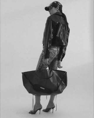 The warmth of leather engages with the cool modernity of PVC, giving rise to a hybrid, versatile, and singular volume.