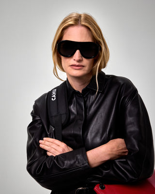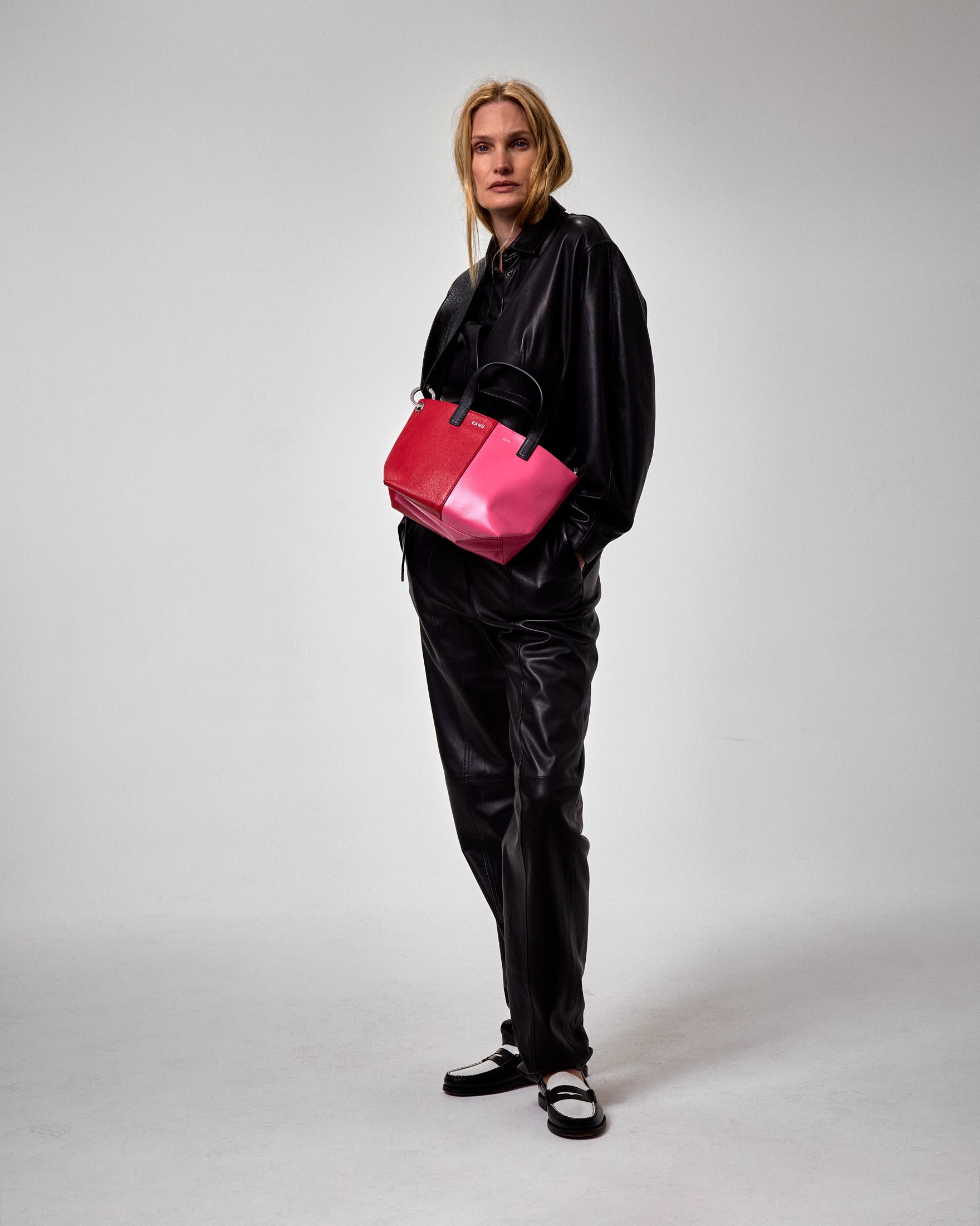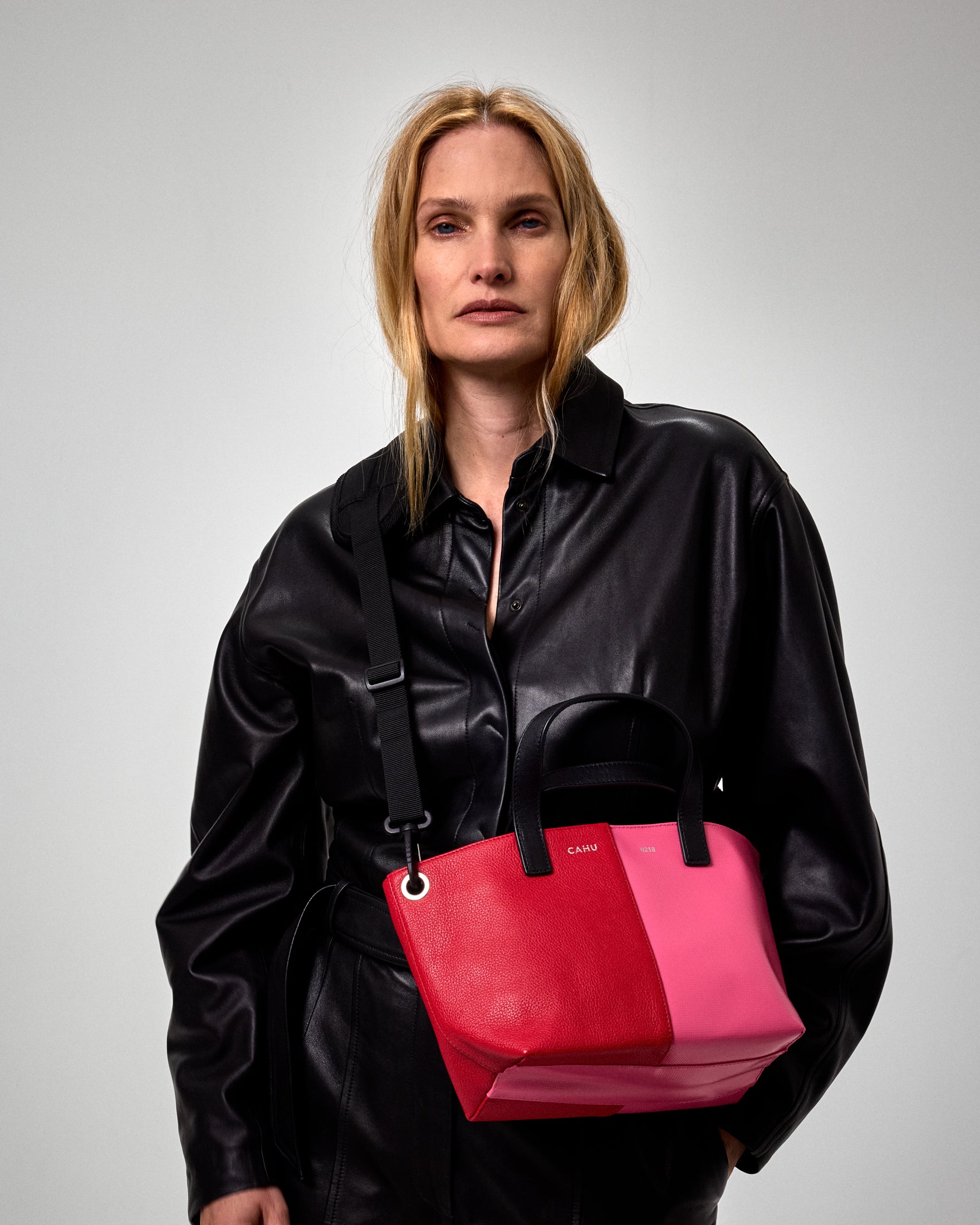 The warmth of leather engages with the cool modernity of PVC, giving rise to a hybrid, versatile, and singular volume.