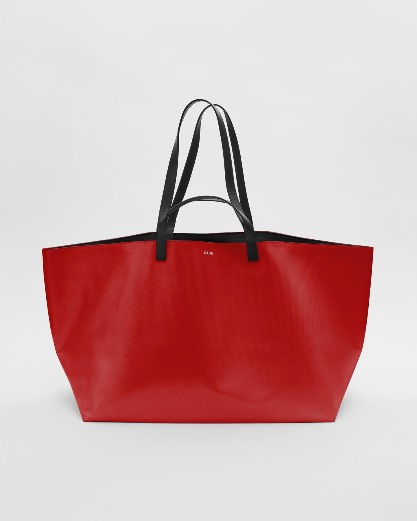 Short handles and long leather straps (for carrying by hand, elbow or shoulder).