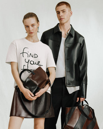 La rencontre est franche, la ligne de rupture précise. Mais entre les deux matières, pas de hiérarchie. Juste une conversation. La chaleur du cuir dialogue avec la froide modernité du PVC pour donner naissance à un volume hybride, versatile et singulier.