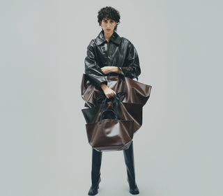 La rencontre est franche, la ligne de rupture précise. Mais entre les deux matières, pas de hiérarchie. Juste une conversation. La chaleur du cuir dialogue avec la froide modernité du PVC pour donner naissance à un volume hybride, versatile et singulier.
